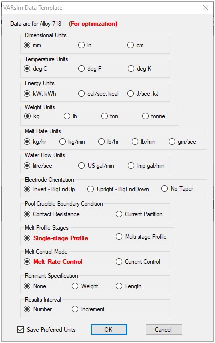 A template of a VARsim data file can be generated from within VARsim by selecting the Create Data Template button. This will display the following menu from which the desired units and major process characteristics can be selected. Other parameters will be generated automatically.
