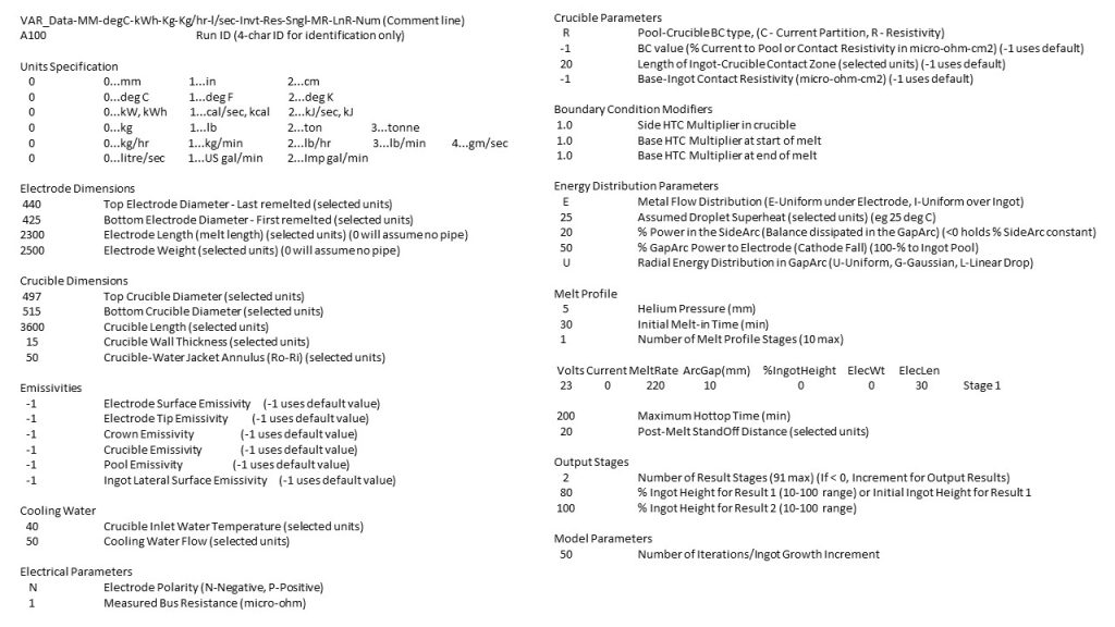 The resulting template will be applicable for melting a nominal 17 in (430 mm) diameter electrode of Alloy 718 into a nominal 20 in (510 mm) diameter crucible. A sample of a VARsim data file is displayed below. Once generated, such a data file may be edited within the Operating Parameter panel of VARsim, or with any text editor.