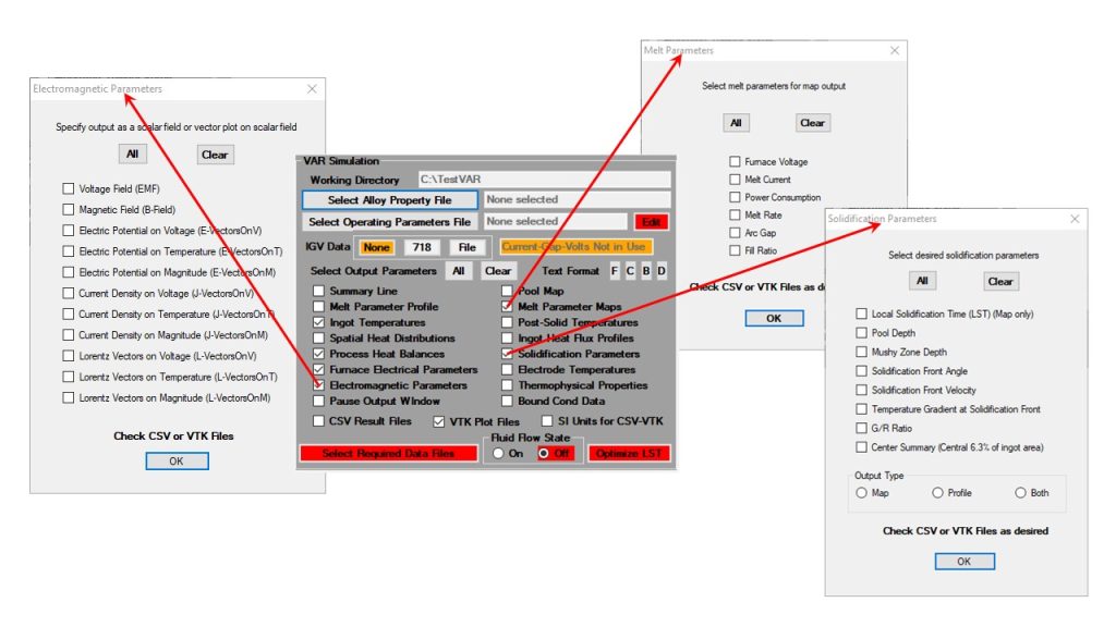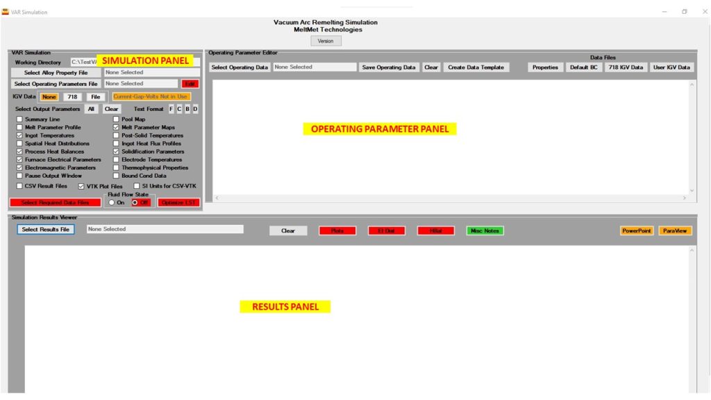 VARsim is a VAR process simulator which incorporates operating parameters and furnace characteristics into electrode, arc, and ingot models to yield a tool suitable for simulating the VAR process from start to finish. Basic input data are expressed in terms of common operating parameters (voltage, current, arc gap, He pressure), heat-specific process parameters (electrode dimensions and weight, crucible dimensions) and furnace characteristics (resistance, water temperature and flow, etc). The use of default value boundary conditions, combined with menu-specified output parameters means that the model can be used by a process engineer having little to no modelling experience.