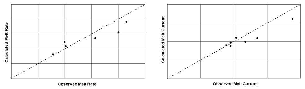 Validation of ESRsim presents more of a challenge due to several factors. In addition to uncertainty in slag thermophysical properties, variation in the specified temperature distribution in the slag due to varying current paths, and inconsistent furnace resistance due to variations in base contact combined with the inclusion of a power factor all introduce more sources of uncertainty. Despite these factors, results for a variety of alloys (718, 600, Waspaloy, 706) in different sizes generally show reasonable agreement between calculated and actual melt parameters. It is quite likely that better agreement could be obtained by inclusion of the correct, specific furnace characteristics.
