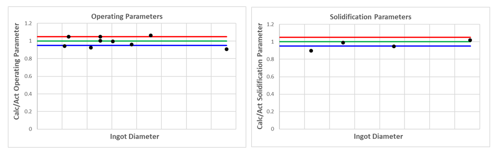 Plots of calculated operating parameters and solidification parameters for a variety of VAR melted alloys (4340, 718, Waspaloy, C300, and M-2) of different ingot diameters generally show good agreement with observed values.