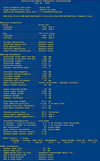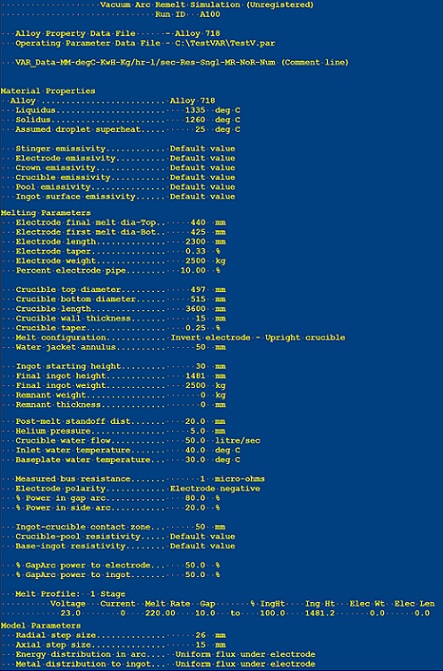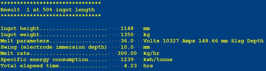 Depending upon which output parameters have been selected, the summary table will be followed by a series of tables presenting the selected output parameters as a function of the appropriate variables (ingot height, melt time, ingot position, etc.).