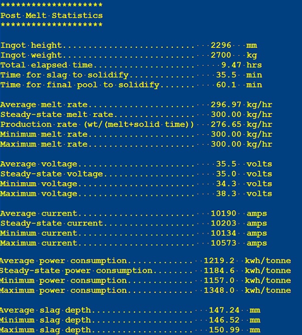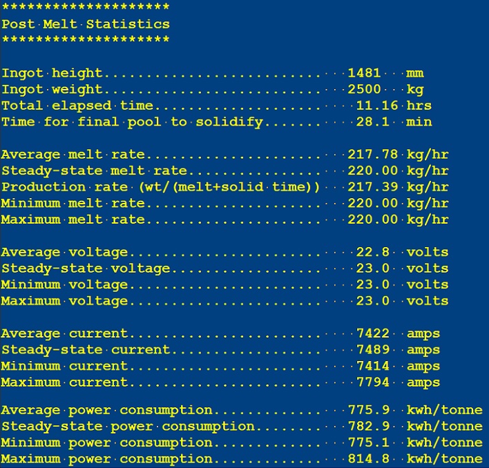 At completion of melting, a summary table of melt statistics is presented as shown below.
