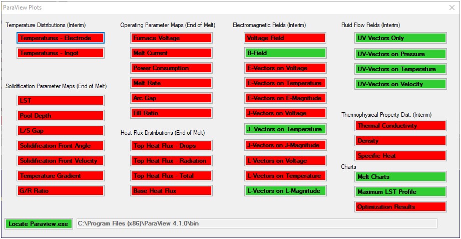 Whenever a results file is loaded into the Results Panel, pressing the Plots button will display an appropriate menu (shown below for VARsim) for loading a VTK file into ParaView. Parameters for which a VTK plot file has been generated are highlighted in green once ParaView has been installed and the location of the paraview.exe executable file has been specified.